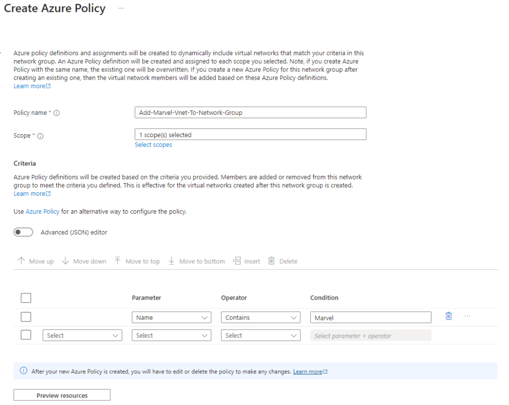 A great little feature Microsoft added here is the possibility for setting up policies to add more virtual network to the groups.