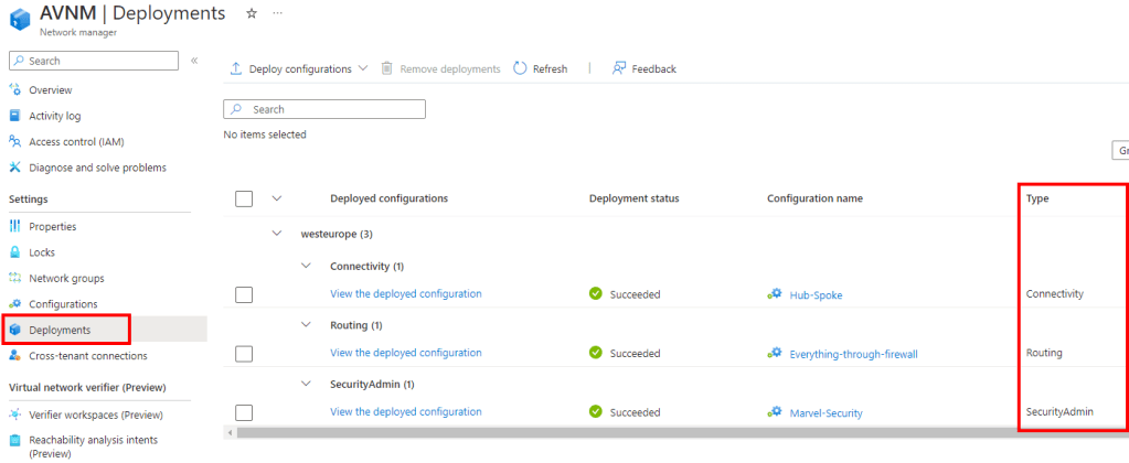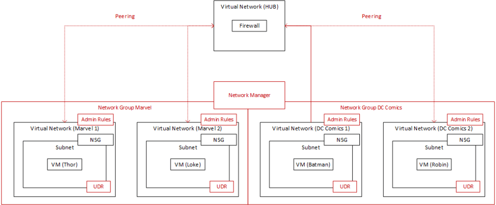 After you have created all of the deployments above you get the following design. The elements marked in red are managed or controlled by AVNM.