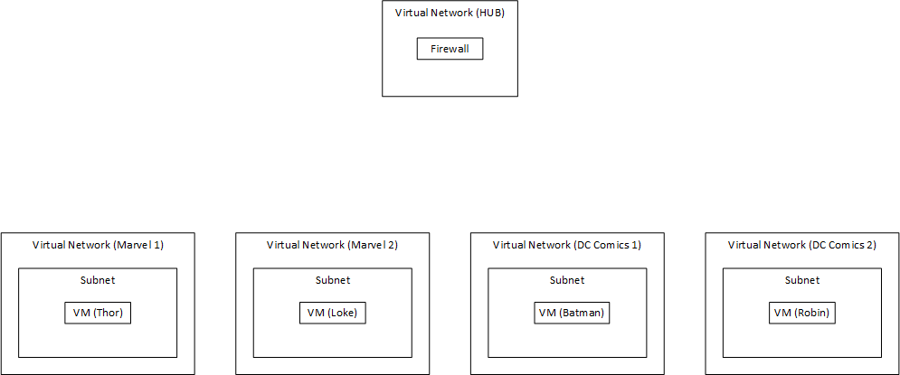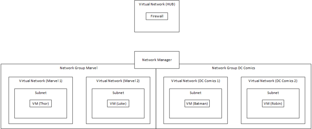 When testing the capabilities I used a simple architecture using a hub-spoke topology with five virtual network. Since AVNM is going to manage a lot of the network elements. I started out with the following elements.