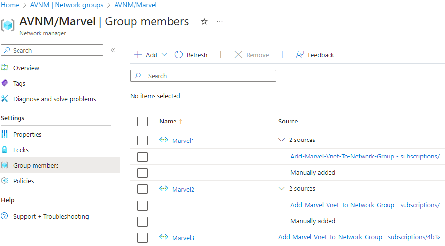 Here I add all virtual network that contains marvel in the name to the Marvel network group. This policy can also be assigned to a management group. If you are using the ALZ approach and have all your virtual network in the corp archetype. This can enforce all the virtual network for the corp archetype to be peered with the hub. It also shows how the network have been added to the group.